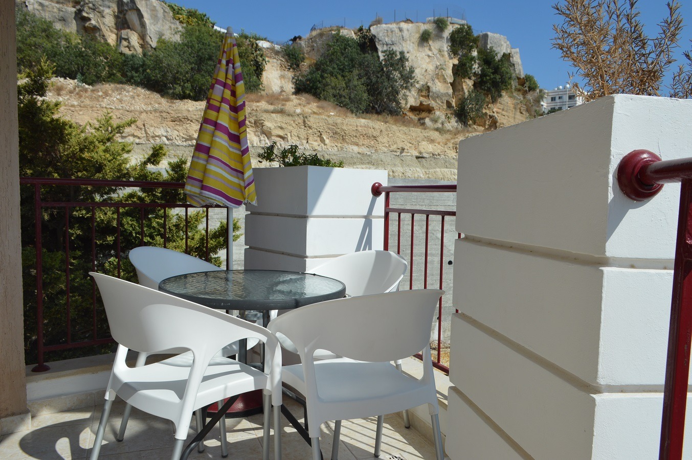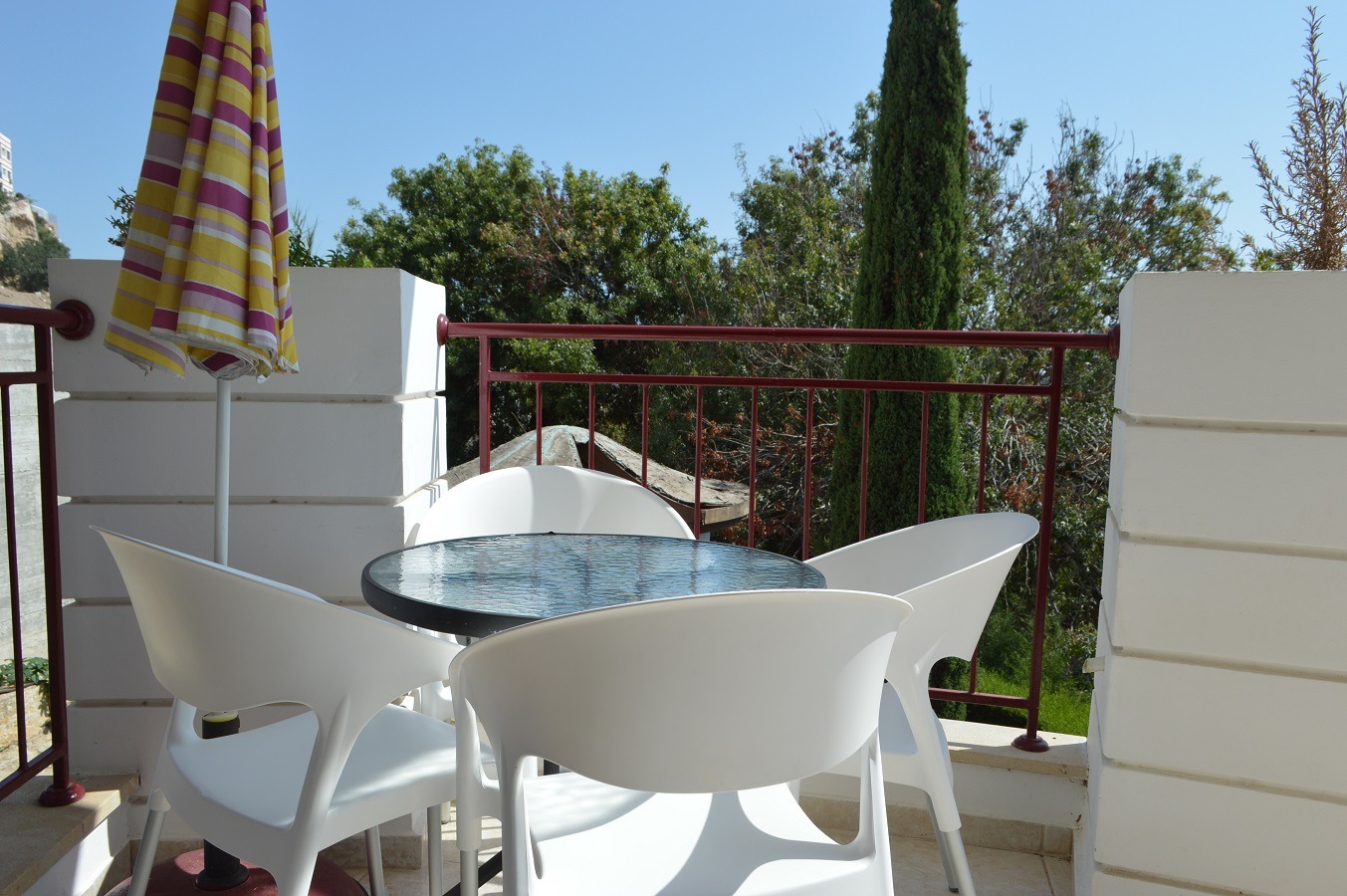 Adjacent to the kitchen is the Guest Cloakroom. Sliding patio doors from the Living Area open up to the Private Balcony with Gardens and some Sea Views.